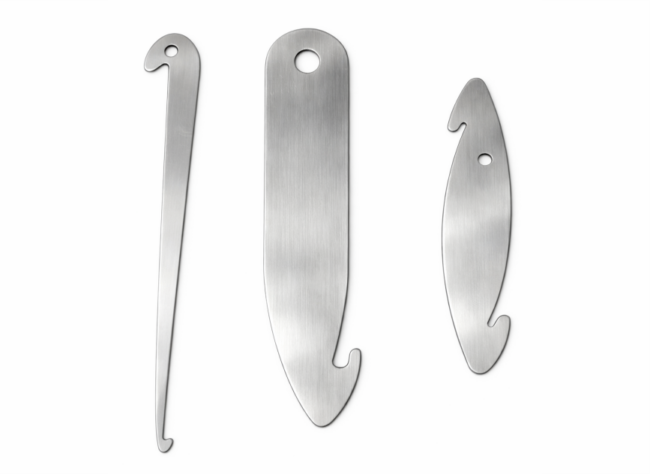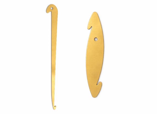 BRASS REED AND HEDDLE HOOK This brass warping tool has a large hook for sleying your reed and a small hook for threading the heddles. Dimensions: 6.5″ long and 0.75″ wide at largest hook end.