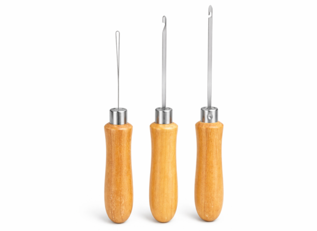 REED AND HEDDLE HOOK WITH WOODEN HANDLE Use for threading heddles on a harness loom or for threading rigid heddle reeds.
